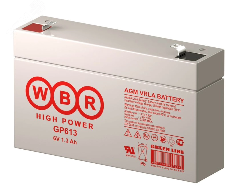 Аккумуляторная батарея WBR GP 613 - герметизированные, выполненные по технологии AGM, батареи общего применения со сроком службы до 8 лет в буферном режиме или 260 циклов заряда-разряда в циклическом режиме при 100% разряде. Эти высокоэффективные перезаряжаемые батареи не требуют обслуживания в течение всего срока службы.