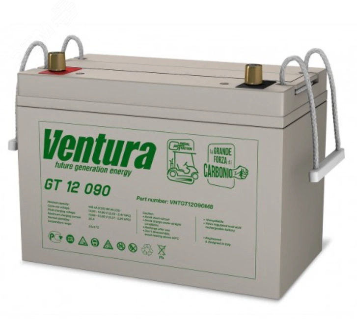 Тяговые аккумуляторные батареи Ventura серии GT выполнены по технологии AGM. Электролит ''заперт'' в стекловолоконных сепараторах, разделяющих положительные и отрицательные свинцовые пластины. Пластины электродов из очищенного высококачественного свинца с легирующими добавками устойчивы к окислению.