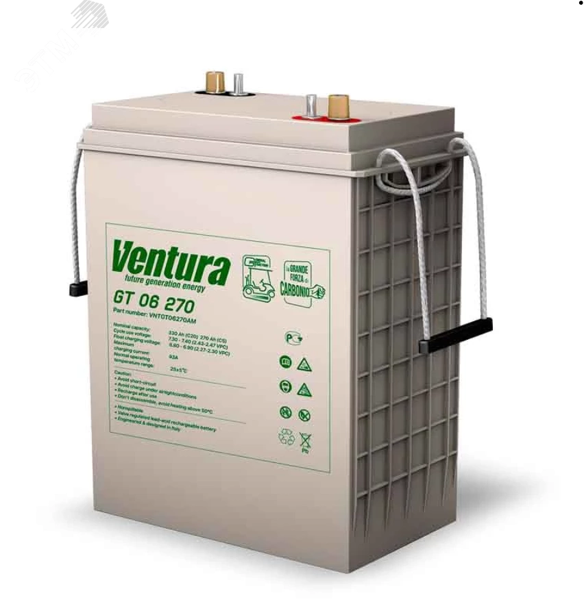 Свинцово-кислотный тяговый аккумулятор VENTURA GT 06 270 (емкость 270 Ач (C5), напряжение 6 вольт) разработан с применением технологии AGM. Она обеспечивает больший срок службы (до 600 циклов при DOD 80%), быструю подзарядку и повышенную температурную устойчивость. Корпус выполнен из прочного ABS пластика и усилен ребрами жесткости. Конструкция полностью герметична и не требует обслуживания, это достигается благодаря наличию одностороннего клапана избыточного давления (VRLA). Тяговый аккумулятор VENTURA GT 06 270подходит для электромоторов лодок, катеров, погрузучно-разгрузочной, полоуборочной и другой электротяговой техники.
