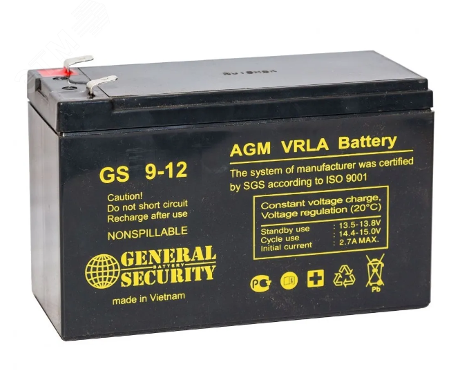 Свинцово-кислотный аккумулятор General Security GSL 9-12 благодаря своим характеристикам (напряжение 12 В, емкость 9 Ач) применяется в таких ответственных системах как - охранная, пожарная, ИБП, телекоммуникации. Корпус из акрило-бутадиен-стирола (ABS) ударопрочный и герметичный, он исключает возможность протекания электролита и испарения газов, что делает его полностью безопасным. При правильной эксплуатации (+25 градусов С) срок службы достигает 7 лет. На крышке располагается VRLA (valve-regulated lead–acid battery) односторонний клапан, который срабатывает при возникновении избыточного давления внутри аккумулятора. General Security GSL 9-12 создан с применением технологии AGM (absorbed glass mat), стекловолоконные сепараторы пропитаны жидким электролитом и удерживают его в неподвижном состоянии.
