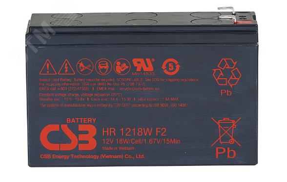 Свинцово-кислотный аккумулятор CSB HR 1218 W (напряжение 12 В) разработан для разряда высоким током за короткое время. Батарея может работать как в циклическом режиме (более 260 циклов разряда-заряда), так и в буферном (до 5 лет). CSB HR 1218 W использует технологию AGM (стекловолоконные сепараторы, пропитанные электролитом), а корпус из ABS-пластика полностью герметичен (долив воды не требуется), что позволяет использовать аккумулятор в любом положении. Аккумуляторная батарея CSB HR 1218 W имеет усовершенствованную конструкцию легированных кальцием электродов из особо чистого свинца, что обеспечивает продолжительный срок службы и улучшенные разрядные характеристики. Аккумулятор отвечает всем современным требованиям к герметизированным батареям, имеет сертификат соответствия Госстандарта РФ (''Ростест''), заключение ВНИИПО МВД ''О пожаровзрывобезопасности''.