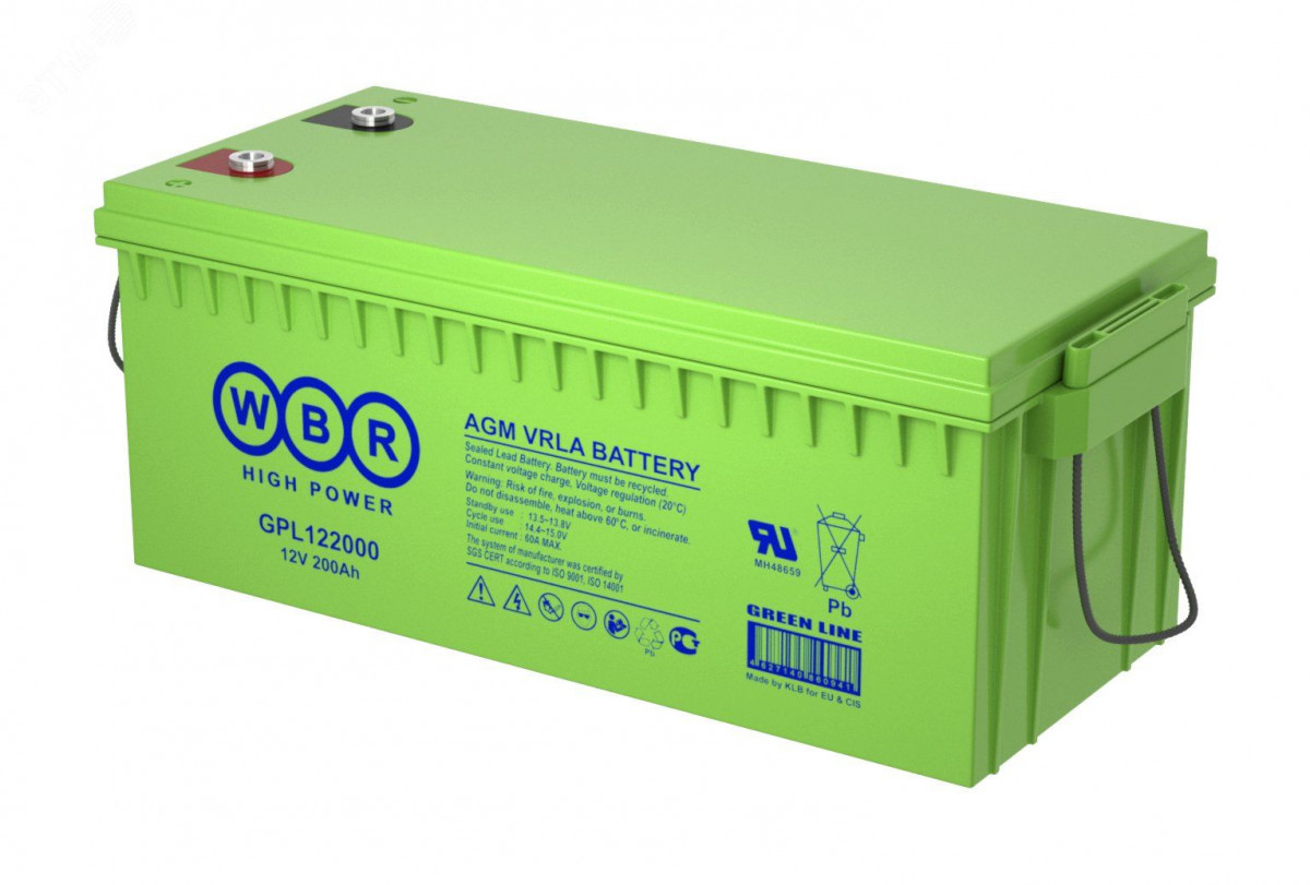 Аккумуляторная батарея WBR серии GPL 122000 - герметизированные, выполненные по технологии AGM, свинцово-кислотные аккумуляторные батареи общего применения со сроком службы 12 лет в буферном режиме или 260 циклов заряда-разряда в циклическом режиме при 100% разряде. Эти высокоэффективные перезаряжаемые батареи не требуют обслуживания в течение всего срока службы.