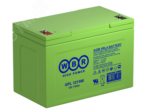 Аккумуляторная батарея WBR серии GPL 121100 - герметизированные, выполненные по технологии AGM, свинцово-кислотные аккумуляторные батареи общего применения с увеличенным 12 летним сроком службы в буферном режиме или 260 циклов заряда-разряда в циклическом режиме при 100% разряде. Эти высокоэффективные перезаряжаемые батареи не требуют обслуживания в течение всего срока службы.