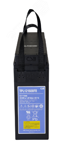 Фронт-терминальный аккумулятор CSB TPL 121600FR (ёмкость 160 Ач, напряжение 12 В) разработан специально для установки в 19” и 23” шкафы и стеллажи. Компактные размеры обеспечивают максимальную плотность энергии на минимальной площади. TPL 121600 FR отличается высокой надёжностью и длительным сроком службы (до 12 лет при правильной эксплуатации), на протяжении которого долив воды не требуется. Жидкий электролит обездвижен стекловолоконными сепараторами (absorbed glass mat), что повышает тепловую устойчивость батарей. Фронт-терминальное расположение клемм существенно упрощает монтаж и обслуживание. Аккумуляторная батарея TPL 121600 FR имеет усовершенствованную конструкцию легированных кальцием электродов из особо чистого свинца, что обеспечивает продолжительный срок службы и улучшенные разрядные характеристики.