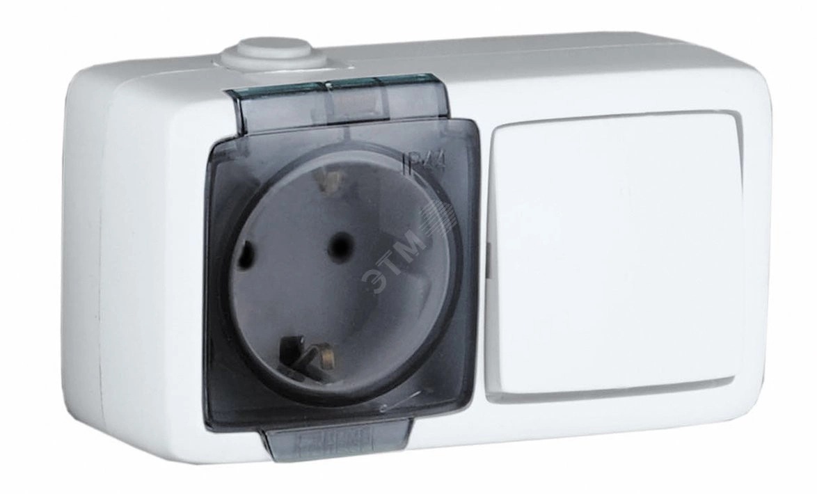 Alfa Блок с пылевлагозащитой, розетка одноместная, с заземляющими контактами, выключатель одноклавишный, белый