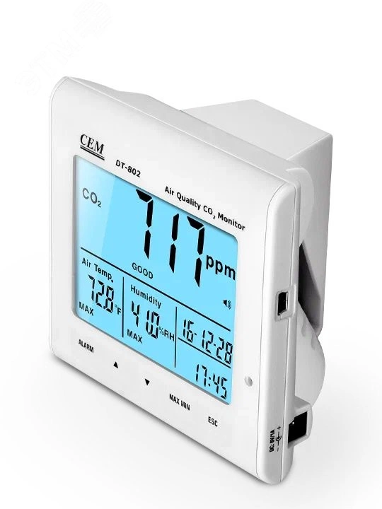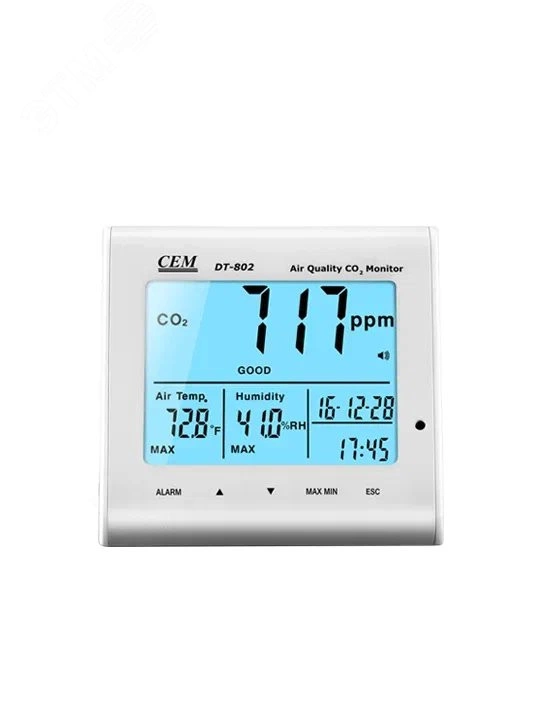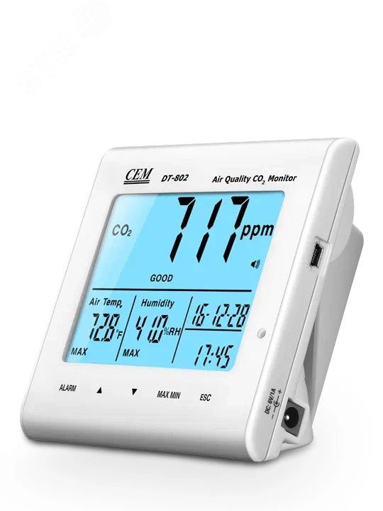 Измеритель DT-802 предназначен для контроля качества воздуха, в том числе отделами охраны здоровья, путем измерения уровня концентрации СО2 в воздухе, например, на предприятиях, в школах, офисах, на транспортных магистралях и т. д. Измеренное значение выражается в ppm (частиц на млн. ) и отображается на ЖК-экране прибора с сопровождающим индикатором качества воздуха - Нормальный (0-800 ppm), Удовлетворительный (800-1200 ppm), Загрязненный (свыше 1200 ppm). В случае превышения допустимой нормы содержания СО2 прибор выдает звуковой сигнал.