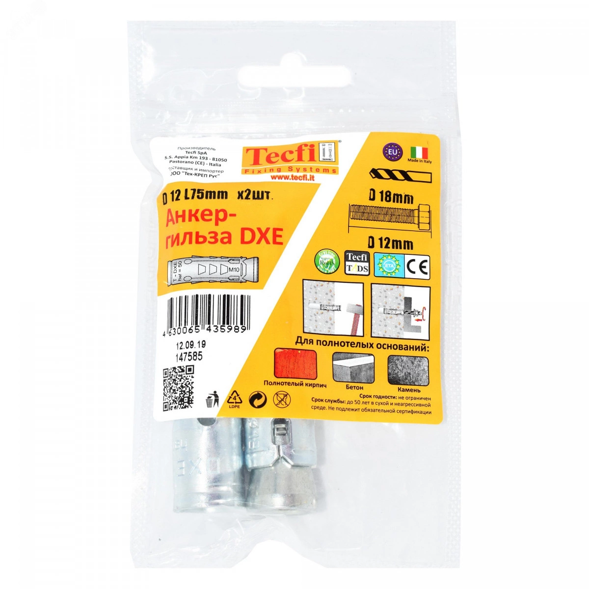 Анкер-гильза DXE ZN М12 (18х75) (2 шт) - пакет Tecfi