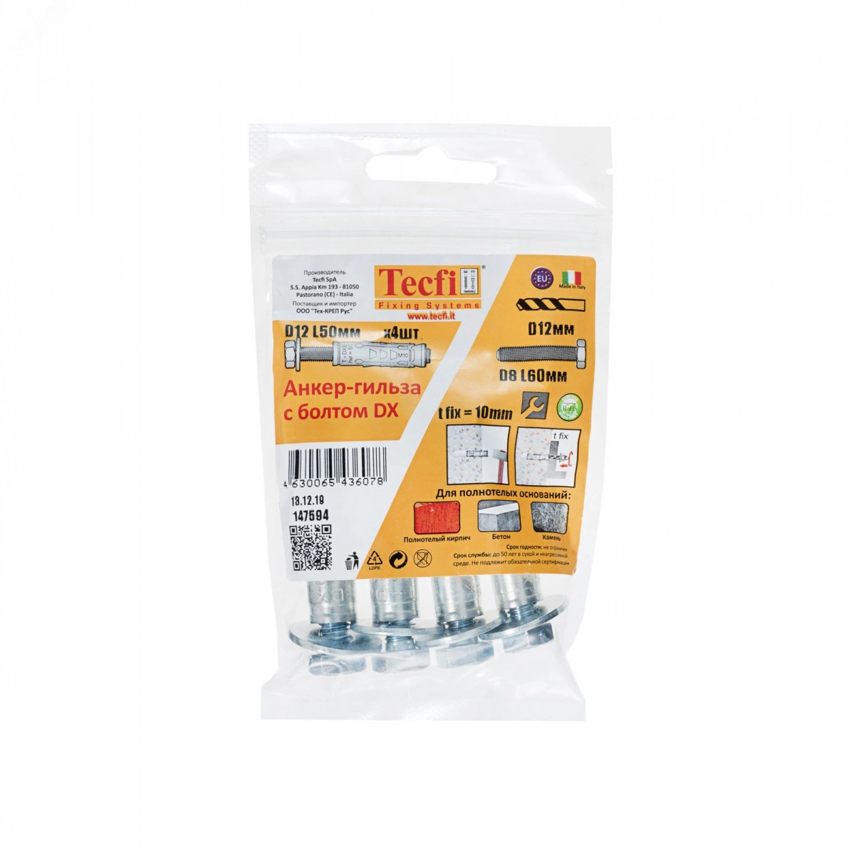 Анкер-гильза с болтом 8.8 DX ZN М8/10 (12х50/10) (4 шт) - пакет Tecfi