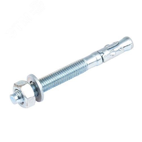 Анкер клиновой представляет собой крепежный элемент в виде шпильки с резьбой, на одном конце которой располагается шайба с гайкой, на другом - распорный узел с муфтой в форме конуса. Предназначен для крепления разнообразных конструкций к бетону, кирпичу или природному камню.