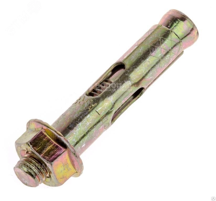 Анкерный болт с гайкой применяется при монтаже оборудования и элементов в полнотелый бетон, кирпич и камень. Анкерный болт с гайкой представляет собой цилиндрическую гильзу состоящую из трех элементов и шпильки, на одном конце которой находится конусный элемент. При закручивании гайки, конусная часть шпильки расширяет элементы гильзы, и фиксирует анкер в основании.