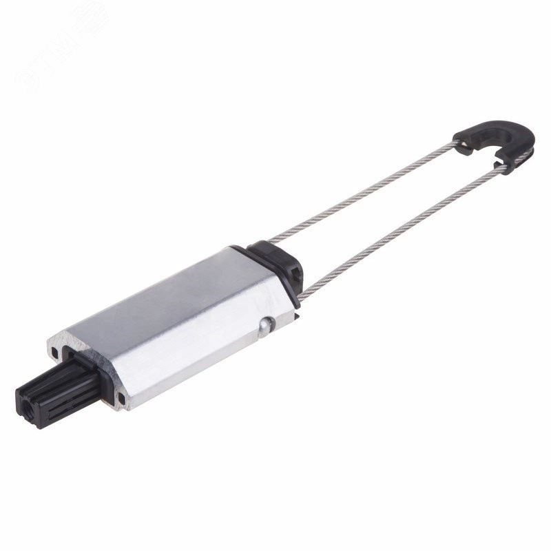 Предназначен для подвески самонесущих проводов типа СИП-2 на концевых и угловых опорах. Зажим рассчитан на монтаж и эксплуатацию при низких температурах. Корпус зажима изготовлен из коррозионностойкого экструдированного алюминиевого сплава, тросик из нержавеющей стали с шаровыми креплениями на обоих концах для удобства надежной фиксации. Внутренняя часть и саморегулирующиеся клинья из армированного диэлектрического пластика, устойчивого к ультрафиолетовому излучению. Не требуется инструмент для монтажа.