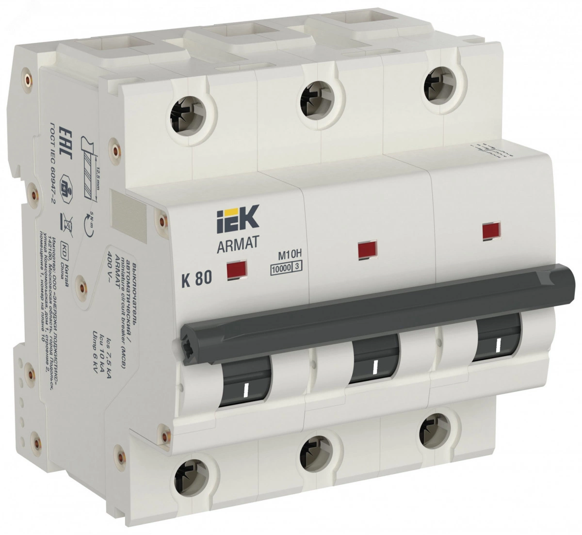 Автоматические выключатели ARMAT серии M10H предназначены для защиты цепей от перегрузки и короткого замыкания. Модельный ряд включает в себя устройства с характеристиками срабатывания B, C, D и Z, L, K на номинальные токи 80 и 100 А с числом полюсов от 1Р до 4Р. Номинальная наибольшая отключающая способность автоматических выключателей ARMAT серии M10H составляет 10 кА. Автоматические выключатели ARMAT серии M10H соответствуют ГОСТ IEC 60947-2 и ГОСТ IEC 60898-1. Конструкцией автоматических выключателей ARMAT серии M10H обеспечивается двойной разрыв контактной системы и двойная дугогасительная камера с совокупным числом де-ионных пластин 24, это двукратно увеличивает падение напряжения на электрической дуге в момент коммутации, за счет чего достигается быстрое и эффективное дугогашение.