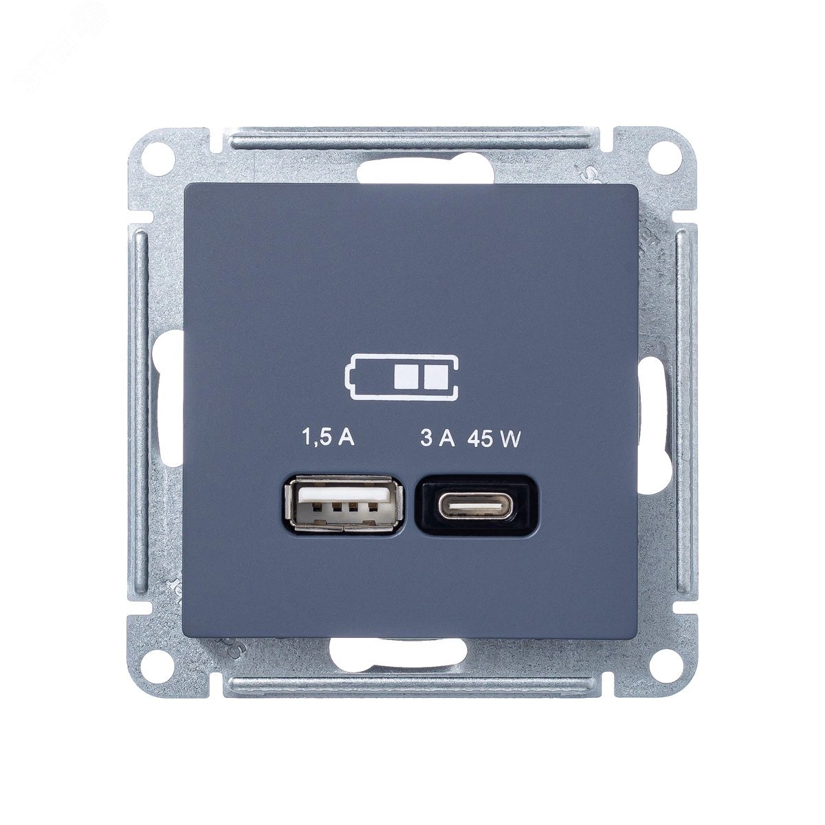 Розетка Systeme Electric серии AtlasDesign (цвет грифель) двойная USB с разъемами типа A плюс C высокоскоростная. Самая современная USB-зарядка с двумя разъемами позволяет заряжать как стандартные мобильные устройства через разъем типа А, так и новейшие устройства с разъемом типа С. Позволяет заряжать смартфоны последнего поколения, которые поддерживают функцию быстрой зарядки. Мощность, тип-A – 7.5 Вт, тип-С - 45Вт. Поддерживает современные протоколы быстрой зарядки QC, PD, последних версий. Лицевые детали из качественного ABS-пластика, устойчивого к царапинам и УФ-излучению.