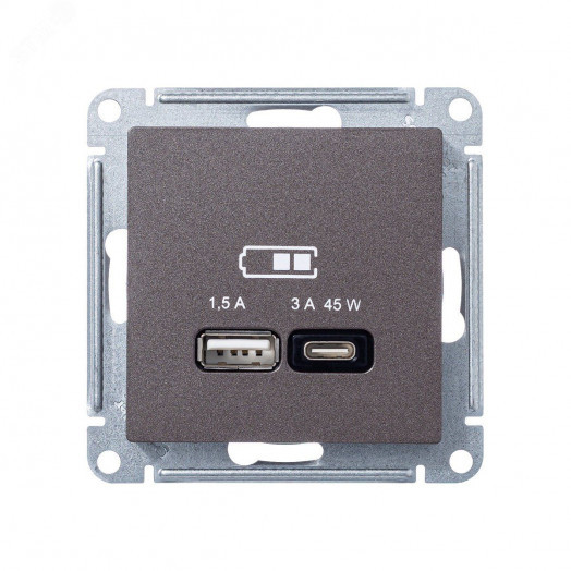 Розетка Systeme Electric серии AtlasDesign (цвет мокко) двойная USB с разъемами типа A плюс C высокоскоростная. Самая современная USB-зарядка с двумя разъемами позволяет заряжать как стандартные мобильные устройства через разъем типа А, так и новейшие устройства с разъемом типа С. Позволяет заряжать смартфоны последнего поколения, которые поддерживают функцию быстрой зарядки. Мощность, тип-A – 7.5 Вт, тип-С - 45Вт. Поддерживает современные протоколы быстрой зарядки QC, PD, последних версий. Лицевые детали из качественного ABS-пластика, устойчивого к царапинам и УФ-излучению.