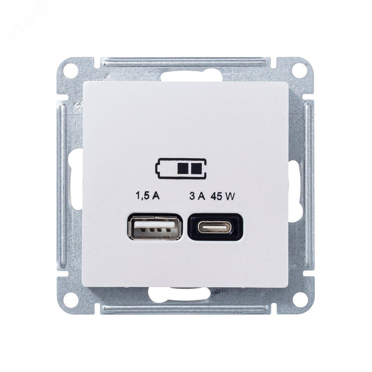 Розетка Systeme Electric серии AtlasDesign (цвет жемчуг) двойная USB с разъемами типа A плюс C высокоскоростная. Самая современная USB-зарядка с двумя разъемами позволяет заряжать как стандартные мобильные устройства через разъем типа А, так и новейшие устройства с разъемом типа С. Позволяет заряжать смартфоны последнего поколения, которые поддерживают функцию быстрой зарядки. Мощность, тип-A – 7.5 Вт, тип-С - 45Вт. Поддерживает современные протоколы быстрой зарядки QC, PD, последних версий. Лицевые детали из качественного ABS-пластика, устойчивого к царапинам и УФ-излучению.