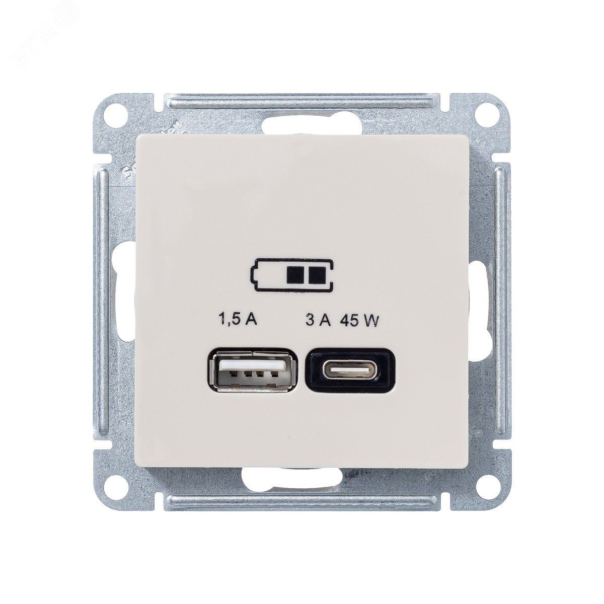 Розетка Systeme Electric серии AtlasDesign (цвет бежевый) двойная USB с разъемами типа A плюс C высокоскоростная. Самая современная USB-зарядка с двумя разъемами позволяет заряжать как стандартные мобильные устройства через разъем типа А, так и новейшие устройства с разъемом типа С. Позволяет заряжать смартфоны последнего поколения, которые поддерживают функцию быстрой зарядки. Мощность, тип-A – 7.5 Вт, тип-С - 45Вт. Поддерживает современные протоколы быстрой зарядки QC, PD, последних версий. Лицевые детали из качественного ABS-пластика, устойчивого к царапинам и УФ-излучению.
