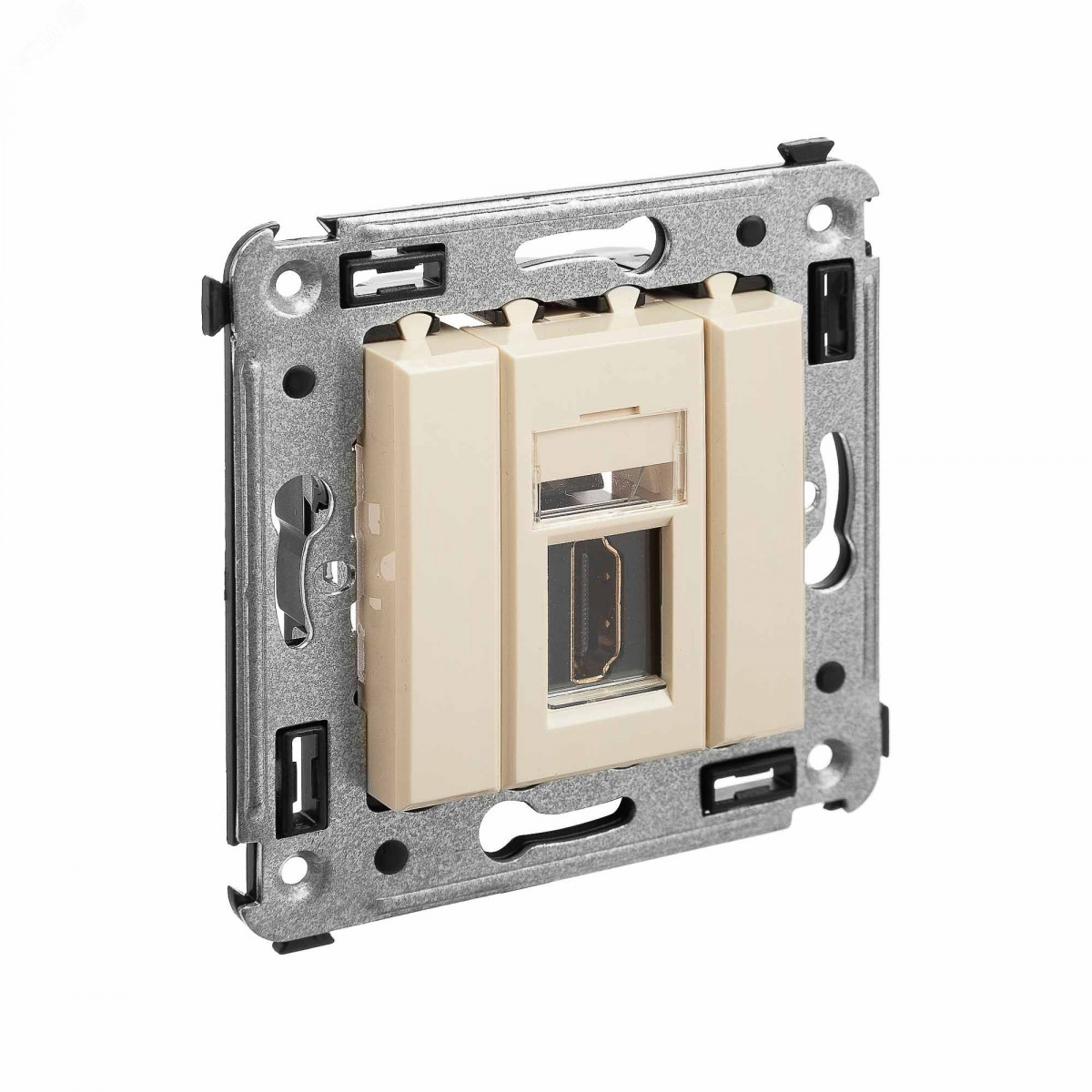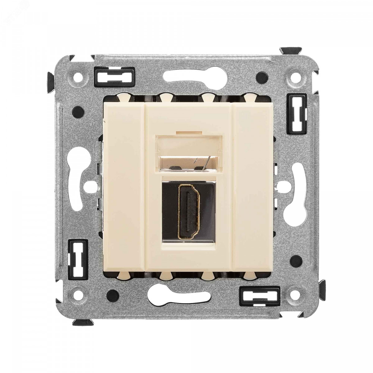 HDMI-розетка. Назначение- для монтажа в подрозеточные коробки глубиной не менее 45 мм (код 59301). Используется в качестве мультимедийной розетки для передачи сигнала (подключение проекторов, мониторов, телевизоров и др.). Характеристики- 1 модуль, с пылезащитной шторкой, с маркировочной табличкой, в комплекте разъем Keystone, для заделки контактов используется инструмент типа 110, тип розетки – ‘А-А‘ или ‘мама-мама‘, фиксация в подрозеточные коробки глубиной не менее 45 мм при помощи каркаса с лапками (код 4400802) и саморезов. Цвет- ‘Ванильная дымка‘.