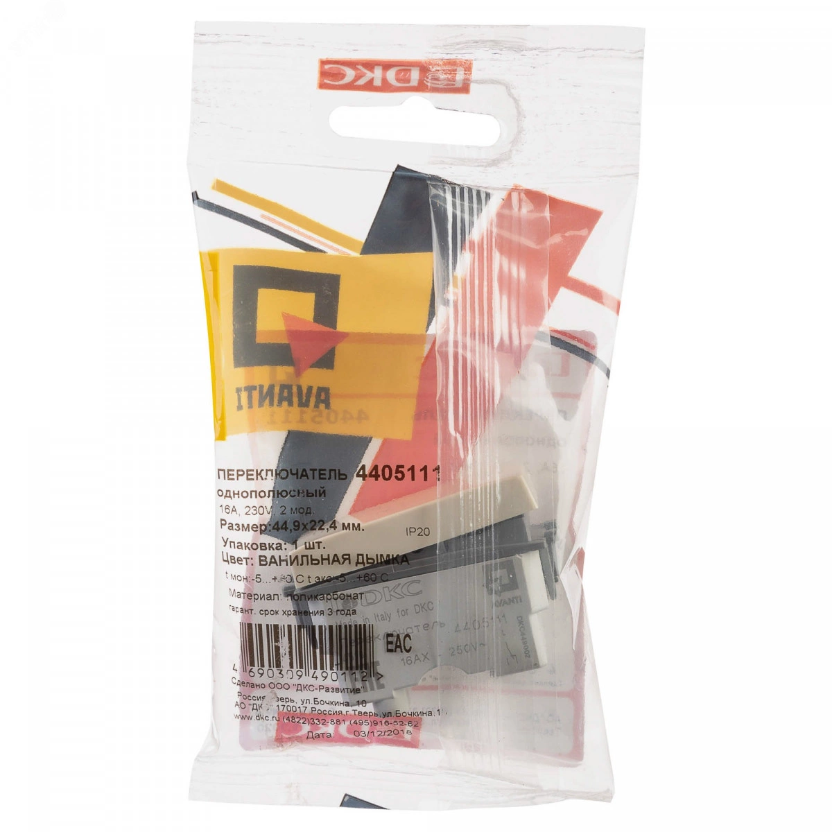 Переключатель модульный серии 'Avanti'. Предназначен для монтажа в системы 'In-liner Front' и 'In-liner Aero' при помощи рамок-суппортов и каркасов 'Avanti' (код 4400912 и т.д.). Используется для включения/выключения освещения с двух мест. Диаметр отверстий для ввода кабелей – 3 мм (по 2 отверстия на одну клемму), винтовые зажимы, шаблон для зачистки кабеля – 11 мм, номинальное напряжение – 230 В. Фиксация в подрозеточные коробки при помощи каркаса с лапками (код 4400802) и саморезов. 1 модуль. Цвет- 'Ванильная дымка'.