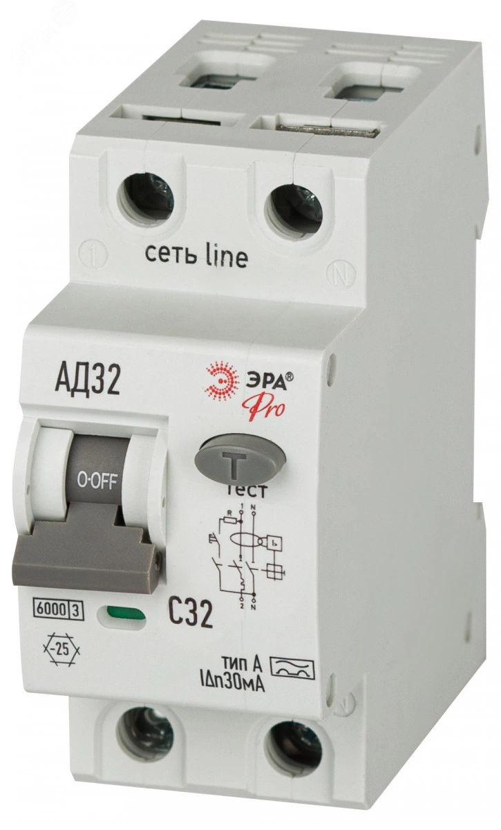 Автоматический выключатель дифференциального тока 6кА ЭРА АД-32 линейки Pro. АВДТ электромеханического типа. Профессиональные АВДТ ЭРА защищают человека от поражения электрическим током при повреждении изоляции электроустановок, предотвращают пожары вследствие токов утечки, предохраняют от перегрузки и короткого замыкания. Рекомендуются для защиты групповых линий, питающих розетки наружной установки, розеток и освещения подвалов и гаражей. Современное решение для квартирных щитков и промышленного применения.