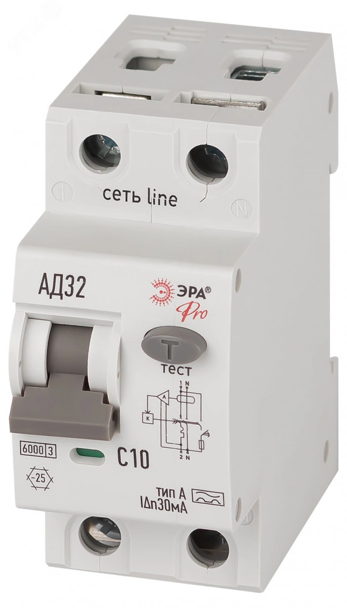 Автоматический выключатель дифференциального тока 6кА ЭРА АД-32 линейки Pro. АВДТ электронного типа. Профессиональные АВДТ ЭРА защищают человека от поражения электрическим током при повреждении изоляции электроустановок, предотвращают пожары вследствие токов утечки, предохраняют от перегрузки и короткого замыкания. Рекомендуются для защиты групповых линий, питающих розетки наружной установки, розеток и освещения подвалов и гаражей. Современное решение для квартирных щитков и промышленного применения.