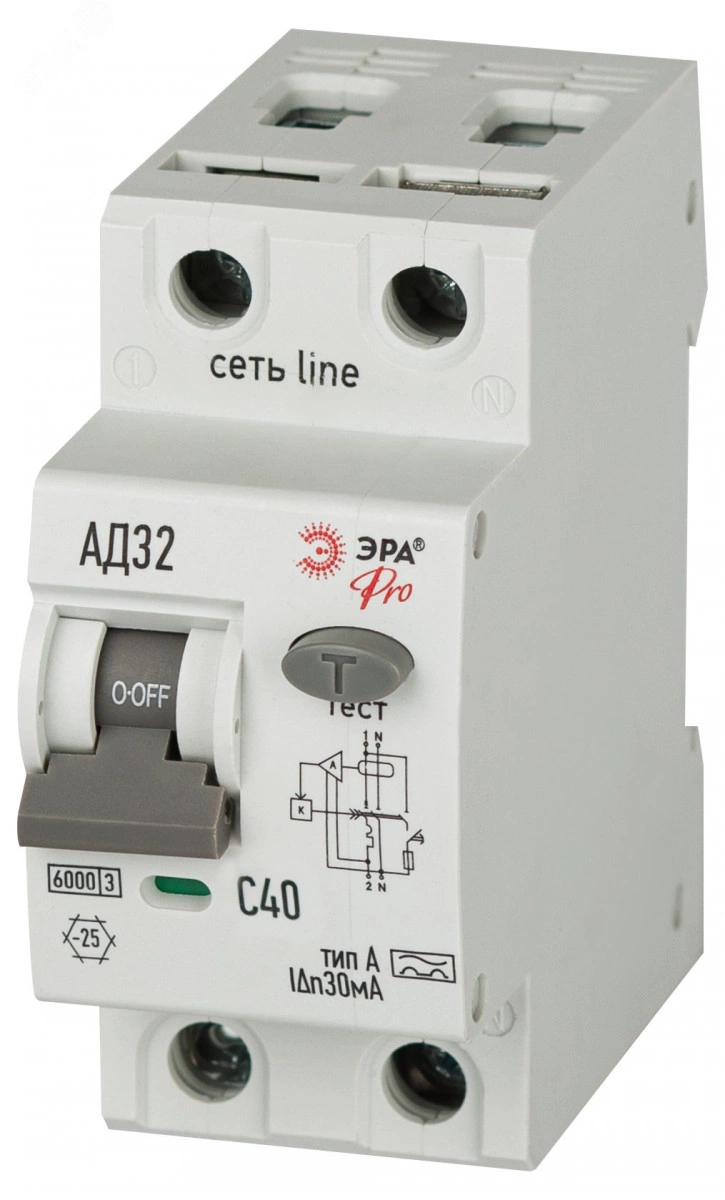 Автоматический выключатель дифференциального тока 6кА ЭРА АД-32 линейки Pro. АВДТ электронного типа. Профессиональные АВДТ ЭРА защищают человека от поражения электрическим током при повреждении изоляции электроустановок, предотвращают пожары вследствие токов утечки, предохраняют от перегрузки и короткого замыкания. Рекомендуются для защиты групповых линий, питающих розетки наружной установки, розеток и освещения подвалов и гаражей. Современное решение для квартирных щитков и промышленного применения.