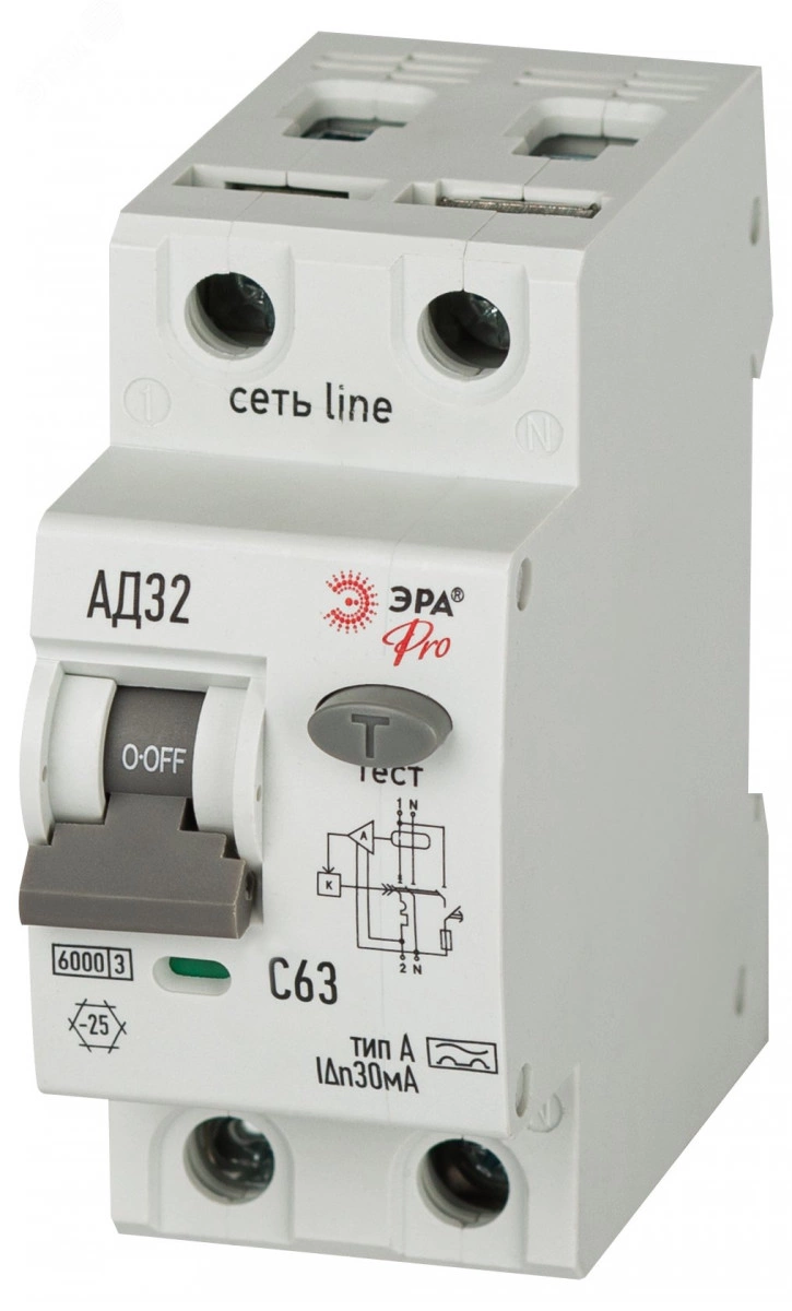 Автоматический выключатель дифференциального тока 6кА ЭРА АД-32 линейки Pro. АВДТ электронного типа. Профессиональные АВДТ ЭРА защищают человека от поражения электрическим током при повреждении изоляции электроустановок, предотвращают пожары вследствие токов утечки, предохраняют от перегрузки и короткого замыкания. Рекомендуются для защиты групповых линий, питающих розетки наружной установки, розеток и освещения подвалов и гаражей. Современное решение для квартирных щитков и промышленного применения.