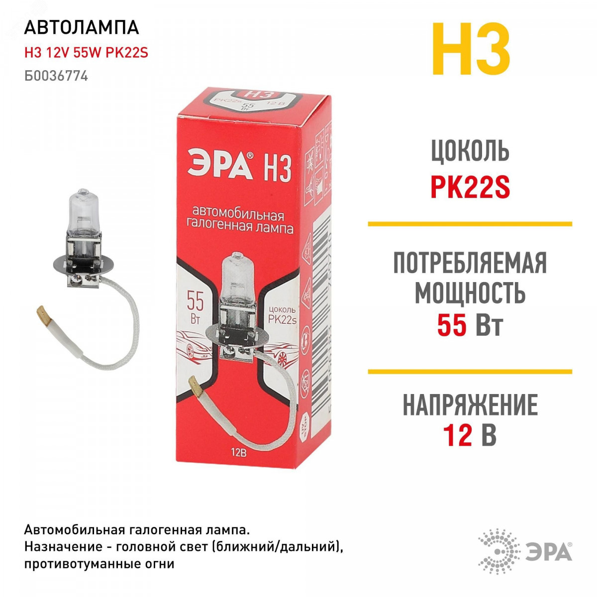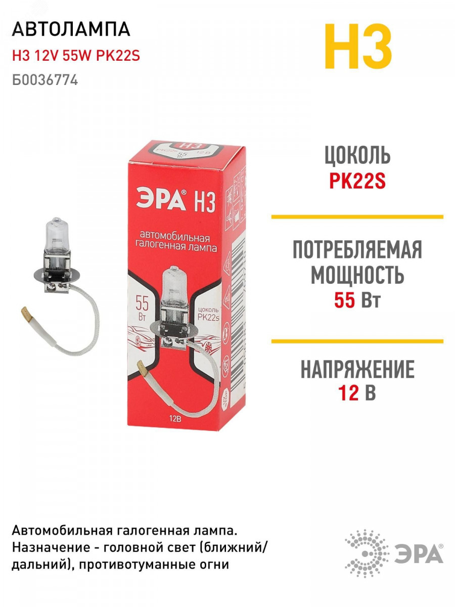 Полное описание: Автолампа Н3 12V 55W PK22s (лампа головного света, противотуманные огни)