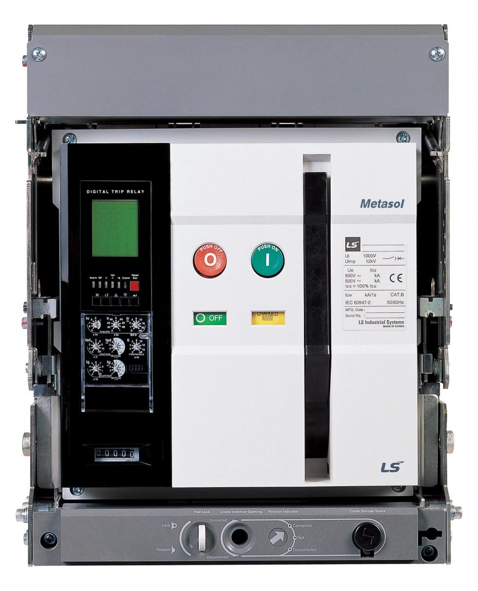 Силовой 3 полюсный воздушный автоматический выключатель переменного тока в выкатном исполнении на номинальный ток 1600 А, с электронным расцепителем (NG5), мотор-приводом, катушкой включения, независимым расцепителем. Корзина заказывается отдельно. Выключатель имеет номинальную отключающую способность 65 кА. Трехполюсные автоматические выключатели LS Electric типа Metasol предназначены для применения в электрических цепях с напряжением 690 В переменного тока частотой 50 гЦ, их защиты от токов короткого замыкания, токов перегрузки, а также для нечастых оперативных включений и отключений.