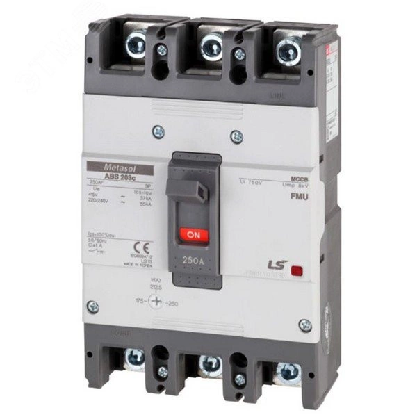 Силовой 3 полюсный автоматический выключатель переменного тока в литом корпусе на номинальный ток 250 А, с термомагнитным регулируемым расцепителем с номинальной отключающей способностью 37 кА. Трехполюсные автоматические выключатели LS Electric типа Metasol ABS предназначены для применения в электрических цепях с напряжением 690 В переменного тока частотой 50 гЦ, их защиты от токов короткого замыкания, токов перегрузки, а также для нечастых оперативных включений и отключений.