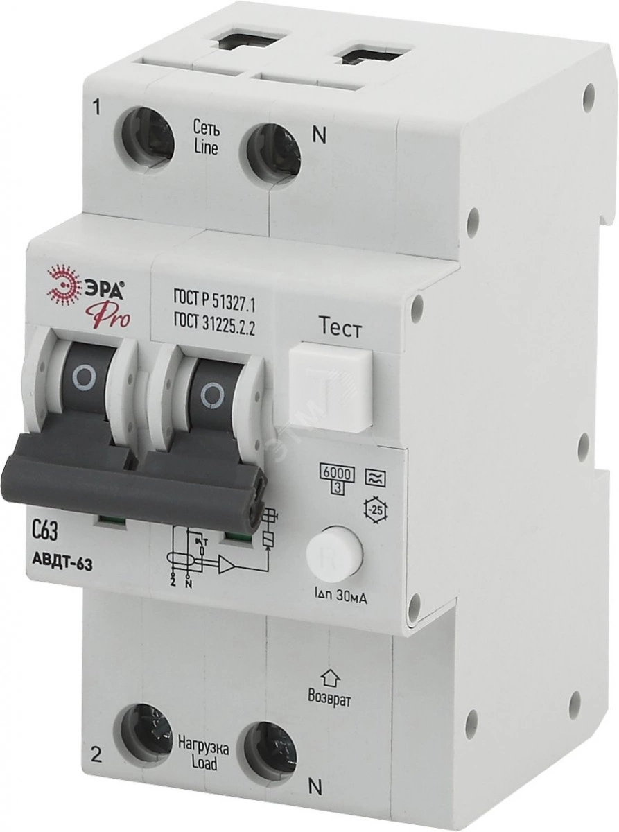 Автоматический выключатель дифференциального тока Pro NO-902-05 АВДТ 63 (А) C63 30mA 6кА 1P+N ЭРА