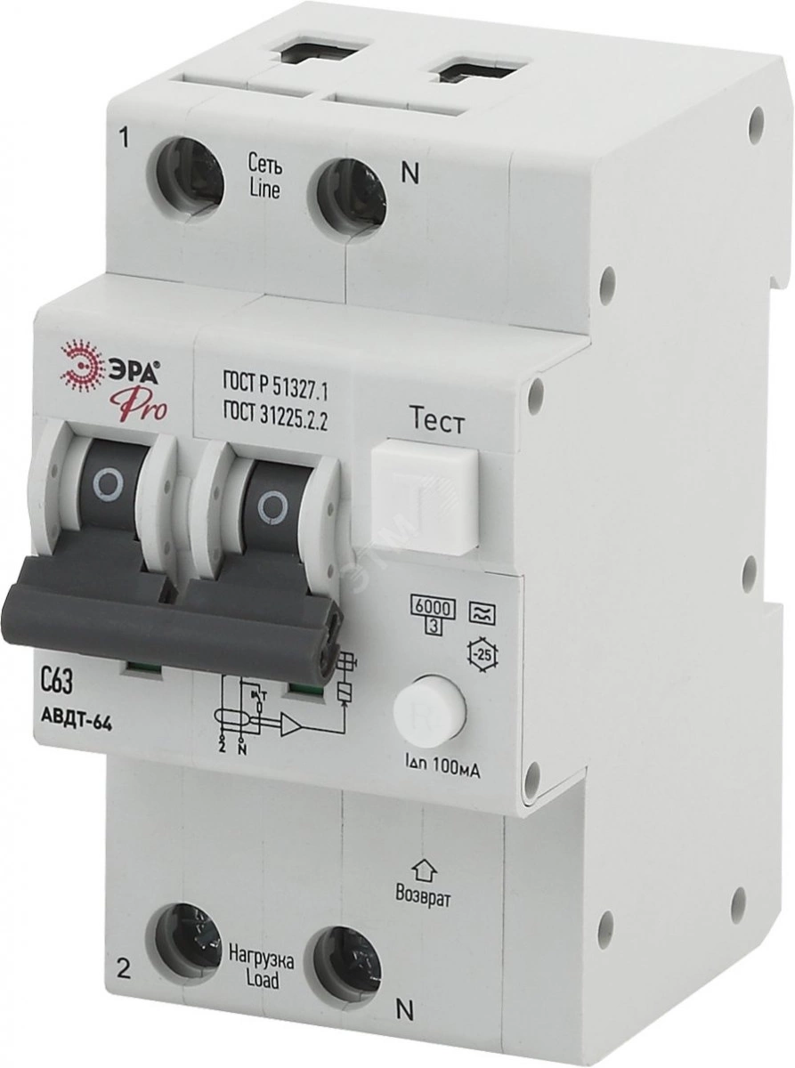 Автоматический выключатель дифференциального тока Pro NO-902-21 АВДТ 64 (А) C63 100mA 6кА 1P+ ЭРА