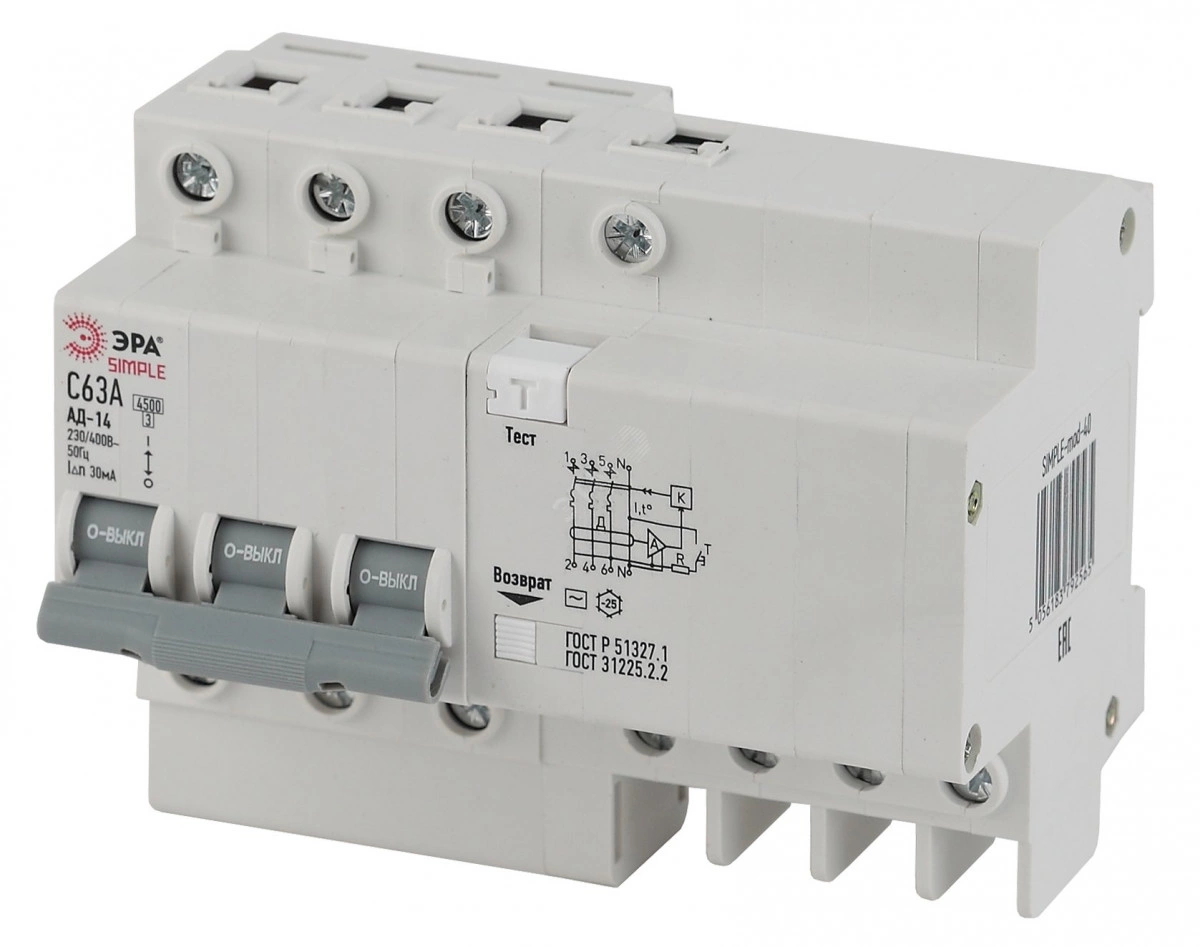 Автоматический выключатель дифференциального тока S SIMPLE-mod-39 АД-14 (AC) C40 30mA 6кА 3P+N