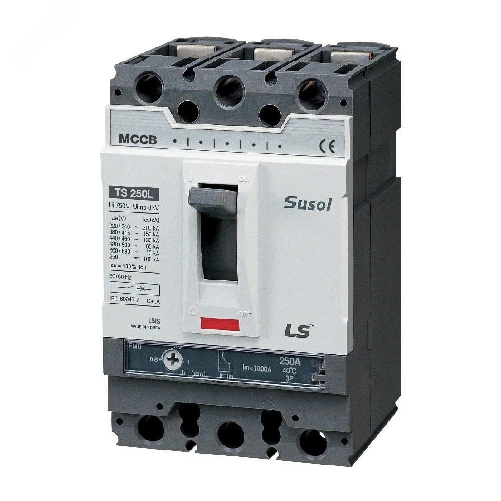 Силовой 3 полюсный автоматический выключатель переменного тока в литом корпусе на номинальный ток 125 А, с термомагнитным регулируемым расцепителем с отключающей способностью 85кА. Трехполюсные автоматические выключатели LS Electric типа Susol TS предназначены для применения в электрических цепях с напряжением 690 В переменного тока частотой 50 гЦ, их защиты от токов короткого замыкания, токов перегрузки, а также для нечастых оперативных включений и отключений.