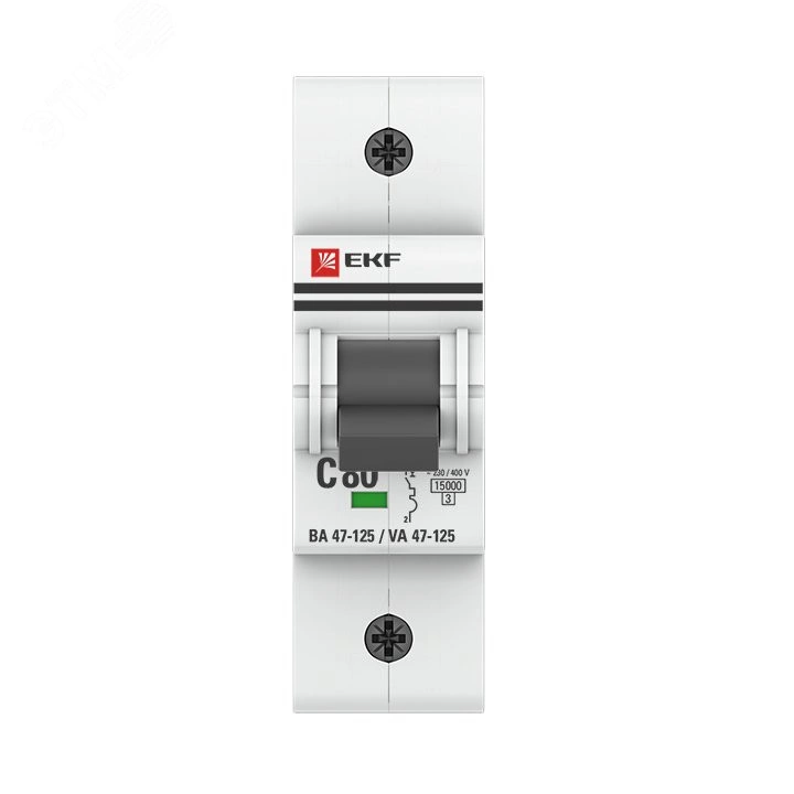 Автоматические выключатели ВА 47-125 предназначены для оперативного управления участками электрических цепей, а так же защиты от токов перегрузки и короткого замыкания в административных, промышленных и жилых зданиях. Благодаря высокой предельной коммутационной способности 15 кА данные выключатели могут использоваться вместо силовых автоматических выключателей. Выключатели имеют ширину корпуса 1,5 модуля (27мм), производятся с номинальными токами до 125 А, в одно-, двух-, трех- и четырех-полюсном исполнениях. Для надежного гашения дуги используется двойной разрыв контактов и две дугогасительные камеры. Оптимальная токопроводимость обеспечивается серебросодержащей контактной группой.