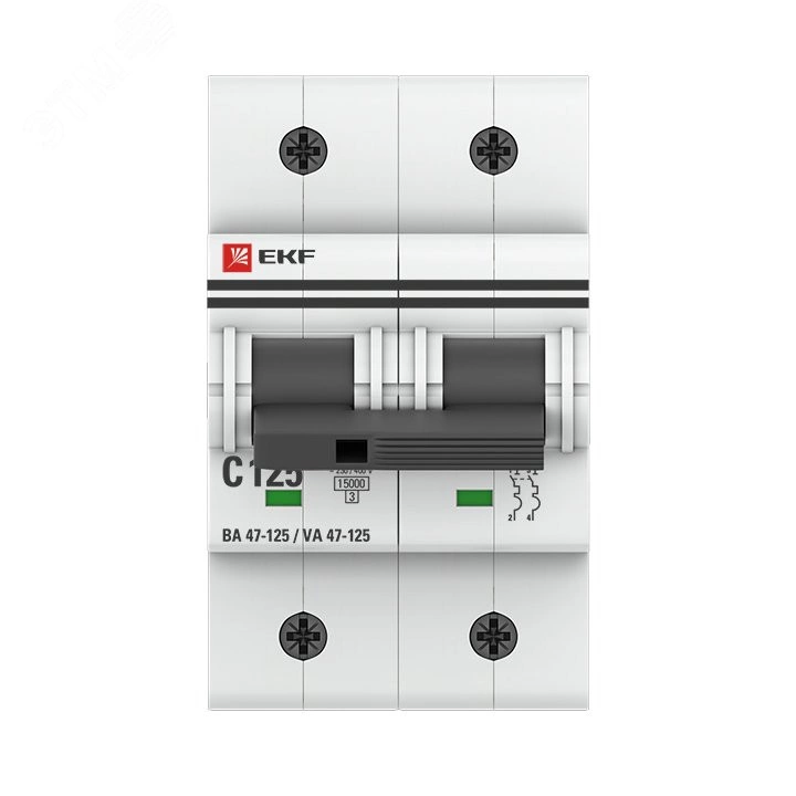 Автоматические выключатели ВА 47-125 предназначены для оперативного управления участками электрических цепей, а так же защиты от токов перегрузки и короткого замыкания в административных, промышленных и жилых зданиях. Благодаря высокой предельной коммутационной способности 15 кА данные выключатели могут использоваться вместо силовых автоматических выключателей. Выключатели имеют ширину корпуса 1,5 модуля (27мм), производятся с номинальными токами до 125 А, в одно-, двух-, трех- и четырех-полюсном исполнениях. Для надежного гашения дуги используется двойной разрыв контактов и две дугогасительные камеры. Оптимальная токопроводимость обеспечивается серебросодержащей контактной группой.