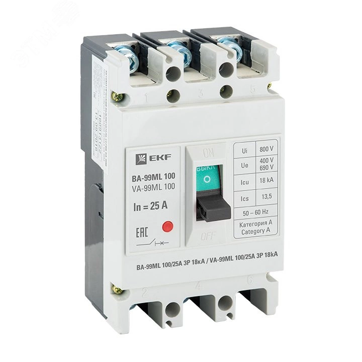 Выключатель ВА-99 выполнен в виде моноблока и состоит из основания и крышки с фальшпанелью, в которой имеется окно для рукоятки управления и толкатель кнопки 'Тест' - проверки механизма отключения выключателя. Основание выполнено из термостойкой пластмассы, не поддерживающей горение и являющейся несущей конструкцией для присоединительных зажимов, неподвижных и подвижных контактов с системой дугогашения, механизма управления, блока защиты от сверхтоков. Крышка закрывает все подвижные элементы механизма управления и внутренние токоведущие части.