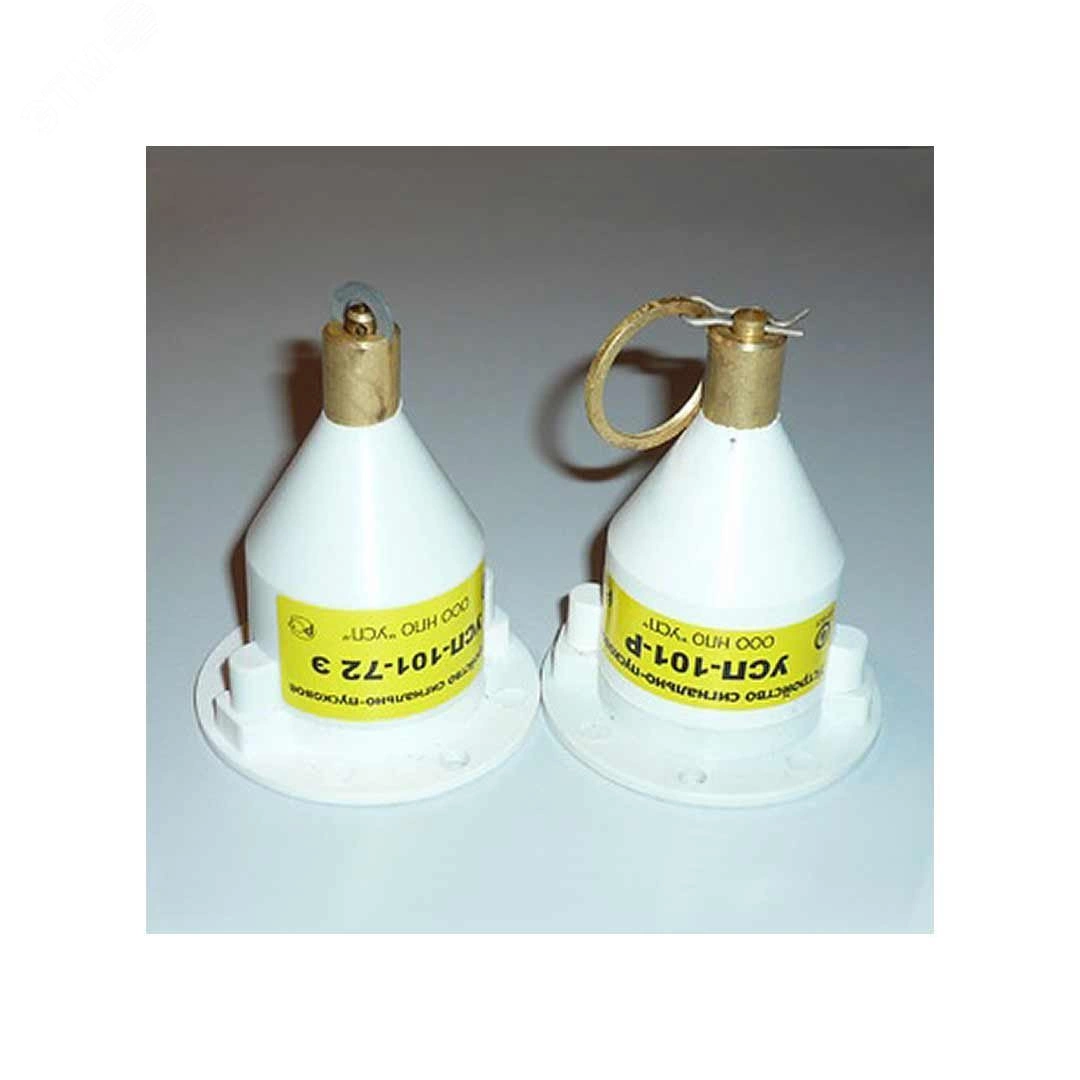Автономный извещатель УСП-101-93-Э. Совмещает в себе тепловой пожарный извещатель и автономный генератор электрического импульса. Применяется в автономных системах пожаротушения в комплекте с модулями порошкового пожаротушения Буран, генераторами огнетушащего аэрозоля Допинг, ТОР для обеспечения группового запуска средств тушения.