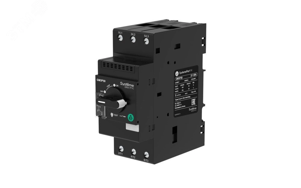 Автоматический выключатель защиты двигателя серии SystemePact GM3P с комбинированным расцепителем, регулируемым в диапазоне 48 - 65 А, с поворотной рукояткой управления и винтовыми зажимами. Автоматические выключатели GM3P предназначены для управления и защиты электродвигателей от перегрузки и короткого замыкания на объектах промышленности, инфраструктуры и строительства, устанавливаются на DIN-рейку или на монтажную плату с помощью винтов.