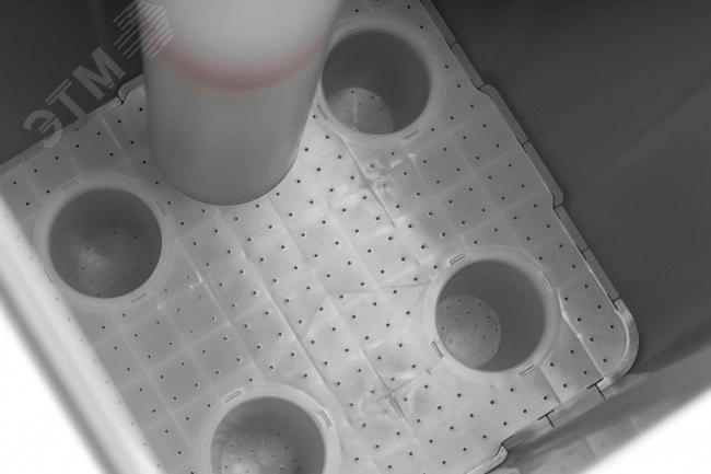 Баки для регенерирующих растворов (соль, перманганат калия) изготавливают из полиэтилена. В состав материала, из которого изготовлен бак, как правило, включают ингибиторы ультрафиолета, что повышает их стойкость к солнечному свету. Баки поставляются в комплекте с литыми крышками, собранными системами забора регенеранта и придонными решетками (фальшдно). Износостойкие полимерные материалы и новейшие производственные технологии обеспечивают их надежную эксплуатацию. Баки Canature имеют коническую форму, это позволяет перевозить их, вставляя один в другой, что на 70 процентов снижает занимаемое пространство и, следовательно, транспортные расходы. Объем, л - 100.