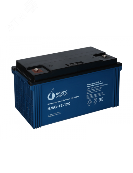 Батареи Парус электро серии HMG – это гелевые свинцово-кислотные, герметизированные, необслуживаемые аккумуляторы с номинальным напряжением 12 В и большим количеством циклов разряда-заряда. Технология GEL с использованием загущённого силикагелем SiO2 электролита повышает температурную стабильность, устойчивость к глубоким разрядам и позволяет после длительного нахождения в разряженном состоянии восстанавливать 100% заряда АКБ. Модели серии HMG применяются в возобновляемых источниках энергии, источниках бесперебойного питания и других автономных источниках электропитания. Напряжение - 12 В, ёмкость - 120 Ач.