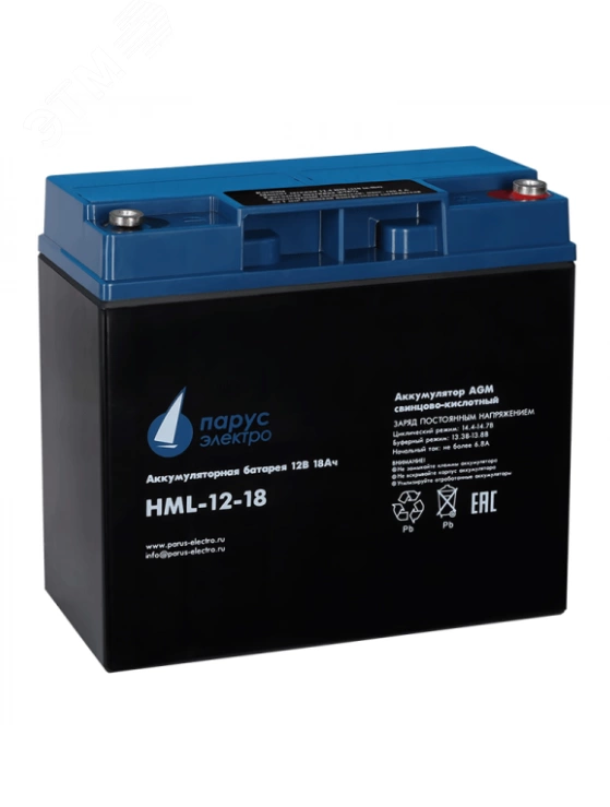 Свинцово-кислотная аккумуляторная батарея HML-12-18 по технологии AGM для длительного срока службы с высокой цикличностью. Применяется для систем бесперебойного питания, безопасности и аварийного освещения, оборудования связи и прочего оборудования с большим количеством циклов разряда - заряда батарей. Электролит заключен в сепараторах между пластин и всегда остается неподвижным, что позволяет эксплуатировать АКБ в любом положении. Напряжение - 12 В, ёмкость - 18 Ач.