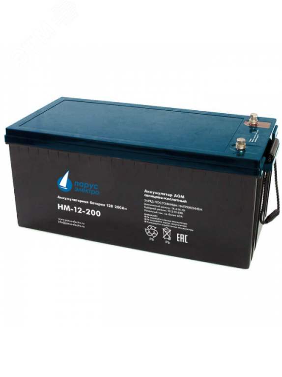 Свинцово-кислотная аккумуляторная батарея HM-12-200 по технологии AGM для циклического режима работы. Применяется в различных системах бесперебойного питания, требовательных электрических приборах (насосах и котлах систем отопления), аварийном энергоснабжении, переносных приборах, а также в стационарных системах с резервным питанием. Электролит заключен в сепараторах между пластин и всегда остается неподвижным, что позволяет эксплуатировать АКБ в любом положении. Напряжение - 12 В, ёмкость - 200 Ач.