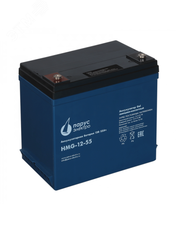Батареи Парус электро серии HMG – это гелевые свинцово-кислотные, герметизированные, необслуживаемые аккумуляторы с номинальным напряжением 12 В и большим количеством циклов разряда-заряда. Технология GEL с использованием загущённого силикагелем SiO2 электролита повышает температурную стабильность, устойчивость к глубоким разрядам и позволяет после длительного нахождения в разряженном состоянии восстанавливать 100% заряда АКБ. Модели серии HMG применяются в возобновляемых источниках энергии, источниках бесперебойного питания и других автономных источниках электропитания. Напряжение - 12 В, ёмкость - 55 Ач.