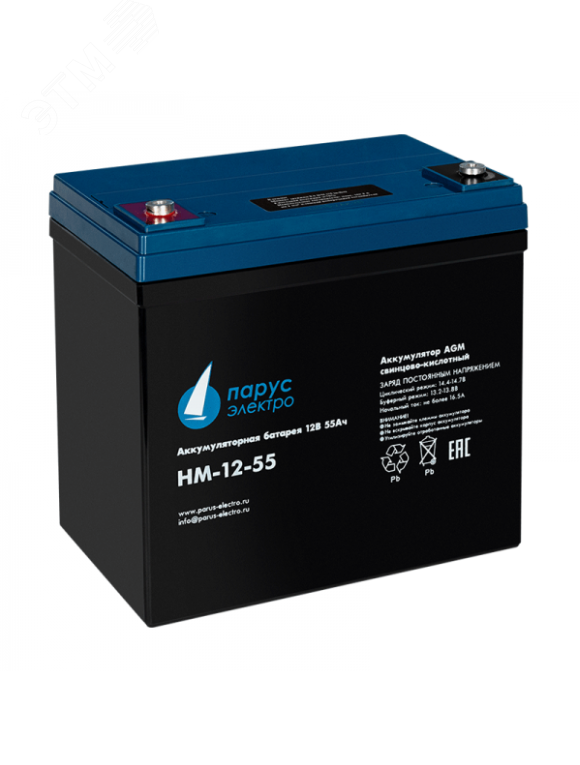 Свинцово-кислотная аккумуляторная батарея HM-12-55 по технологии AGM для циклического режима работы. Применяется в различных системах бесперебойного питания, требовательных электрических приборах (насосах и котлах систем отопления), аварийном энергоснабжении, переносных приборах, а также в стационарных системах с резервным питанием. Электролит заключен в сепараторах между пластин и всегда остается неподвижным, что позволяет эксплуатировать АКБ в любом положении. Напряжение - 12 В, ёмкость - 55 Ач.