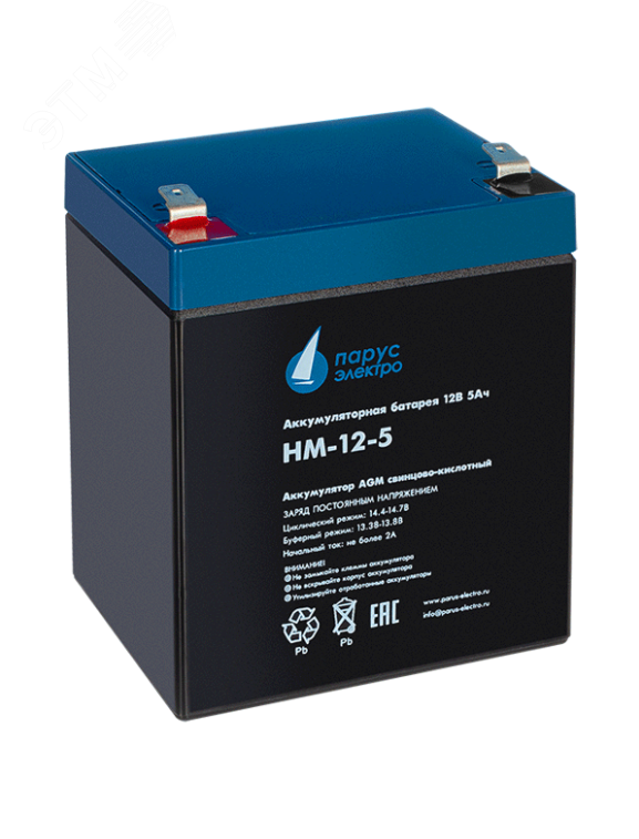 Свинцово-кислотная аккумуляторная батарея HM-12-5 по технологии AGM для циклического режима работы. Применяется в различных системах бесперебойного питания, требовательных электрических приборах (насосах и котлах систем отопления), аварийном энергоснабжении, переносных приборах, а также в стационарных системах с резервным питанием. Электролит заключен в сепараторах между пластин и всегда остается неподвижным, что позволяет эксплуатировать АКБ в любом положении. Напряжение - 12 В, ёмкость - 5 Ач.