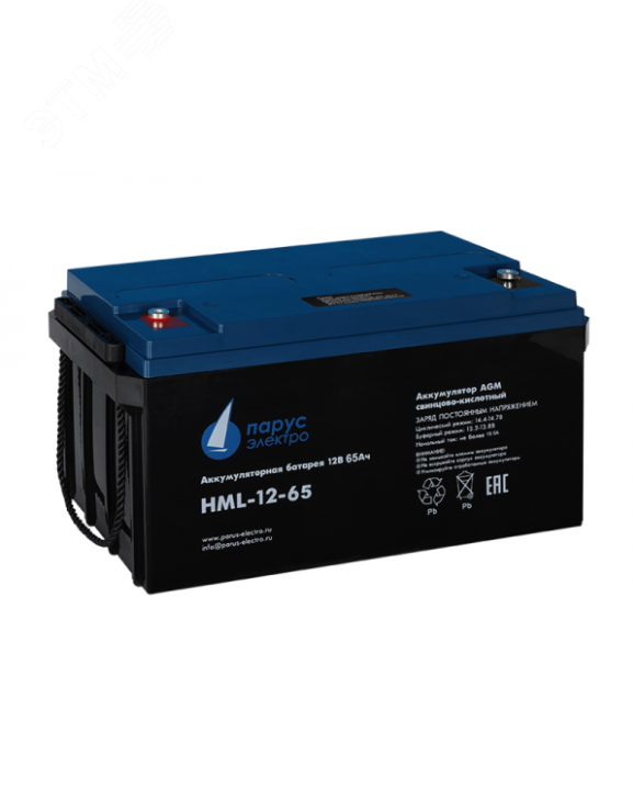 Свинцово-кислотная аккумуляторная батарея HML-12-65 по технологии AGM для длительного срока службы с высокой цикличностью. Применяется для систем бесперебойного питания, безопасности и аварийного освещения, оборудования связи и прочего оборудования с большим количеством циклов разряда - заряда батарей. Электролит заключен в сепараторах между пластин и всегда остается неподвижным, что позволяет эксплуатировать АКБ в любом положении. Напряжение - 12 В, ёмкость - 65 Ач.