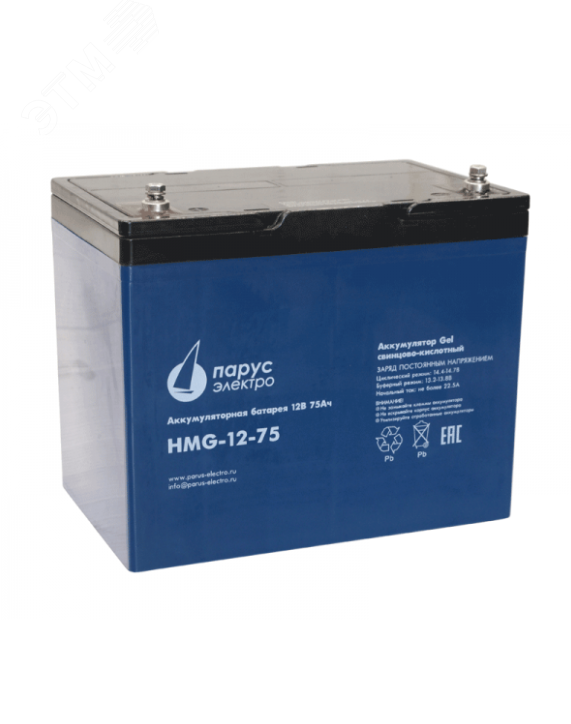 Батареи Парус электро серии HMG – это гелевые свинцово-кислотные, герметизированные, необслуживаемые аккумуляторы с номинальным напряжением 12 В и большим количеством циклов разряда-заряда. Технология GEL с использованием загущённого силикагелем SiO2 электролита повышает температурную стабильность, устойчивость к глубоким разрядам и позволяет после длительного нахождения в разряженном состоянии восстанавливать 100% заряда АКБ. Модели серии HMG применяются в возобновляемых источниках энергии, источниках бесперебойного питания и других автономных источниках электропитания. Напряжение - 12 В, ёмкость - 75 Ач.