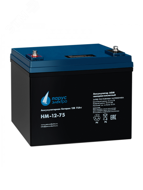 Свинцово-кислотная аккумуляторная батарея HM-12-75 по технологии AGM для циклического режима работы. Применяется в различных системах бесперебойного питания, требовательных электрических приборах (насосах и котлах систем отопления), аварийном энергоснабжении, переносных приборах, а также в стационарных системах с резервным питанием. Электролит заключен в сепараторах между пластин и всегда остается неподвижным, что позволяет эксплуатировать АКБ в любом положении. Напряжение - 12 В, ёмкость - 75 Ач.