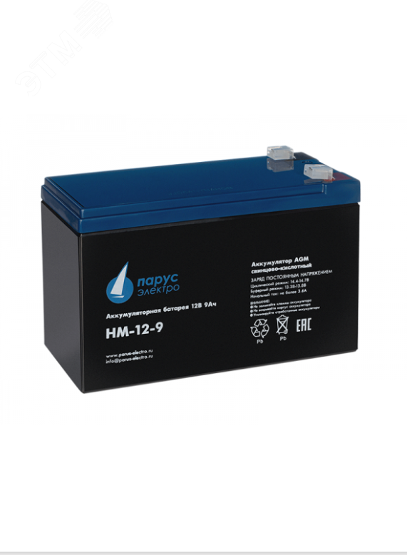 Свинцово-кислотная аккумуляторная батарея HM-12-9 по технологии AGM для циклического режима работы. Применяется в различных системах бесперебойного питания, требовательных электрических приборах (насосах и котлах систем отопления), аварийном энергоснабжении, переносных приборах, а также в стационарных системах с резервным питанием. Электролит заключен в сепараторах между пластин и всегда остается неподвижным, что позволяет эксплуатировать АКБ в любом положении. Напряжение - 12 В, ёмкость - 9 Ач.