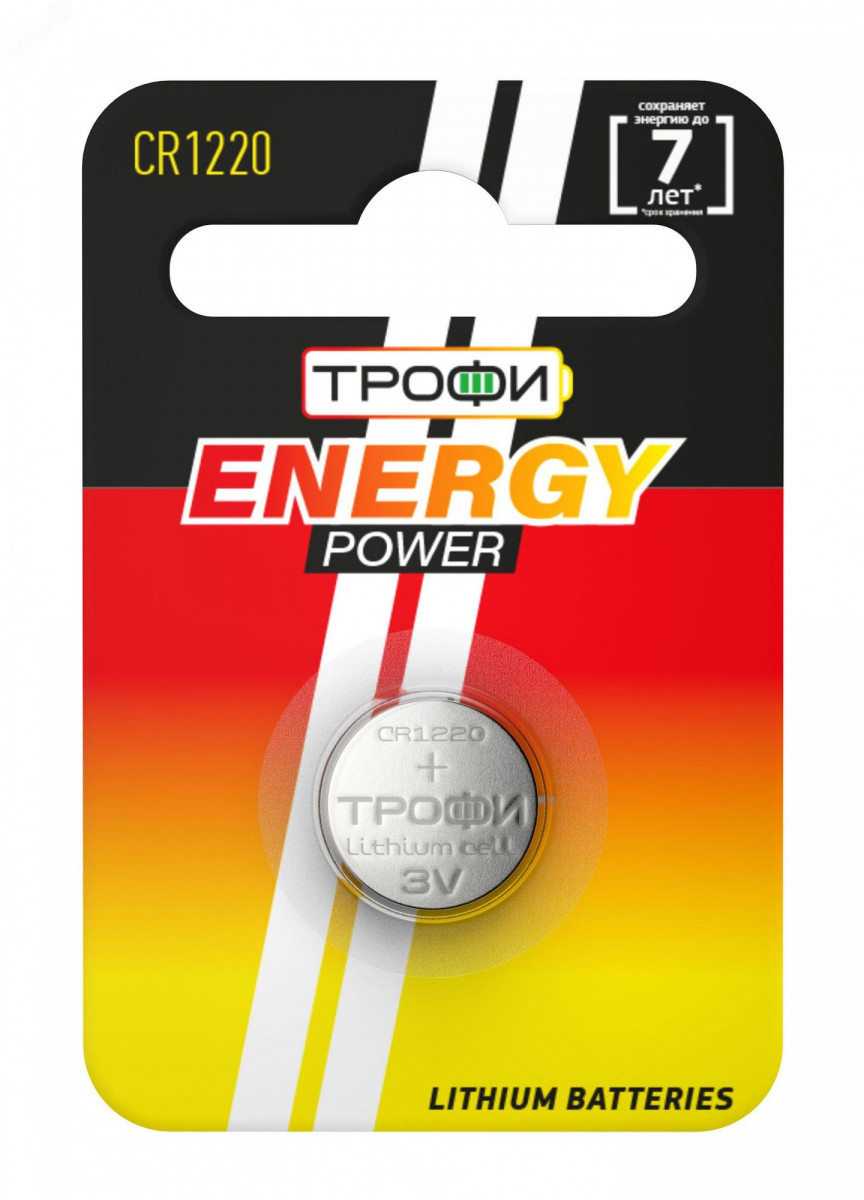 Элемент питания Трофи CR1220-1BL ENERGY POWER Lithium. Плоский литиевый элемент. Взаимозаместимость DL1220. Срок службы или срок годности 7 лет